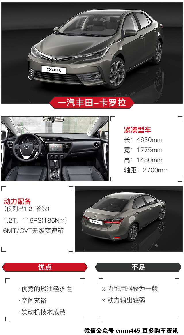卡罗拉的特点相信大家都非常清楚,尤其是低油耗,真是为了我们省下不少油钱。卡罗拉有着不错的可靠性和较强的综合能力,这就是它的优势。丰田的CVT变速箱是现今市场上资历较老且技术较成熟的变速箱,有着不错的平顺性,2700mm的轴距也为驾乘人员带来不错的乘坐空间。